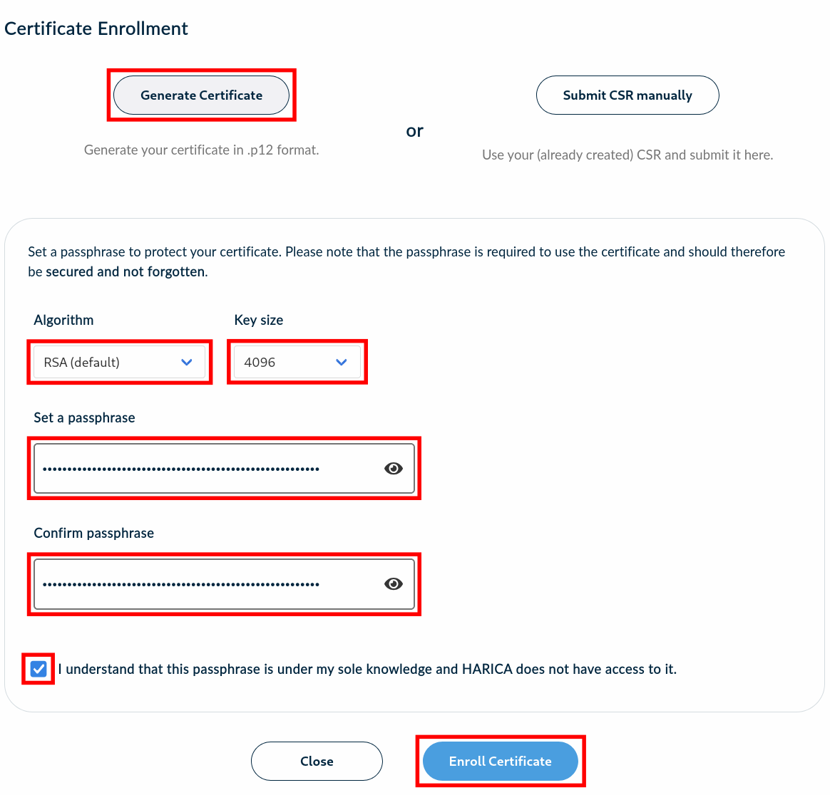 Enter this password under Set a passphrase, and also under Confirm Passphrase, confirm the checkbox and then click Enroll Certificate.